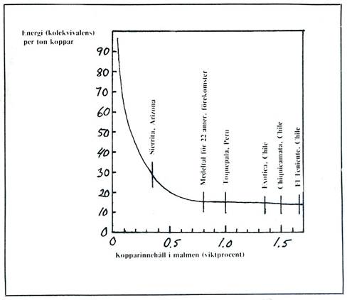 Figur 1 visar energikostnaderna vid framställning av 1 ton koppar som funktion av viktprocenten koppar i malmen.[19] Man kan se, att energiförbrukningen för utvinning stiger exponentiellt för malmer med kopparhalt under 0,35%, vilket idag anses vara gränsen för lönsam kopparbrytning.